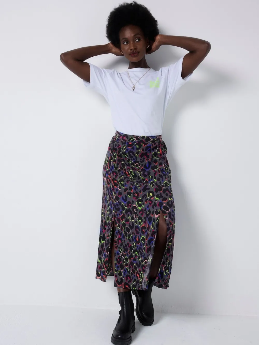 Our grey with rainbow shadow leopard and lightning bolt print split front skirt is a statement-making pick that can be amped up for special occasions or pared back with a chunky knit and boots. It’s designed with an elasticated waist on the back for easy comfort. Made from soft viscose crepe with elasticated waist on the back. Side splits at the hem. Signature neon pink embroidered lightning bolt on the hip. Model in the image is size 10-12, height 5’10”, wearing a size 12. Machinewasbaar. 100% viscose.