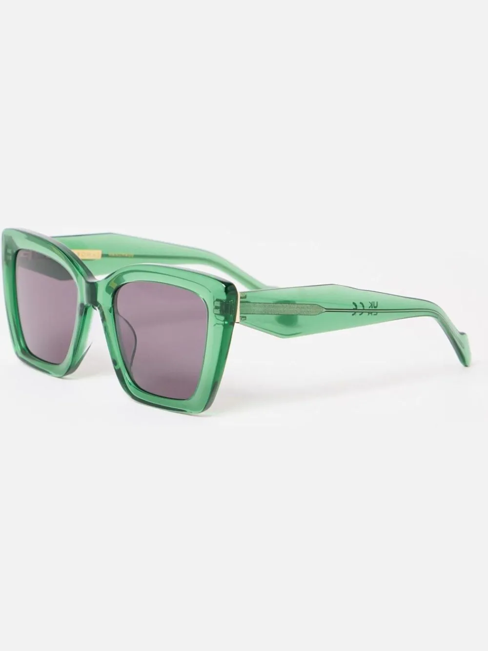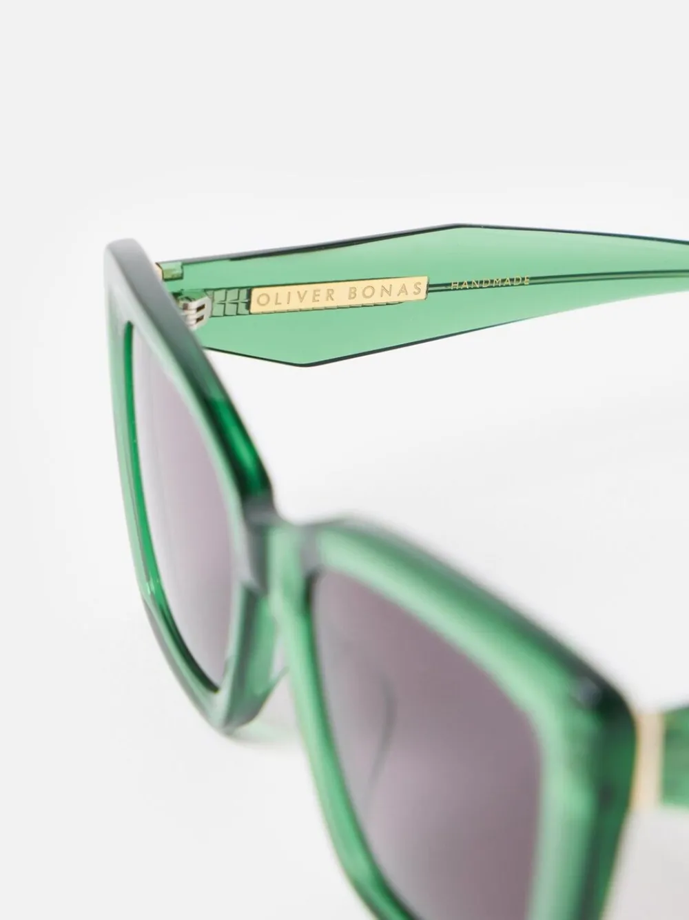 Cat eye acetate sunglasses with square dark grey tinted lenses, a clear green frame and matching arms featuring a glitter detail and wide shape. 100% acetaat.