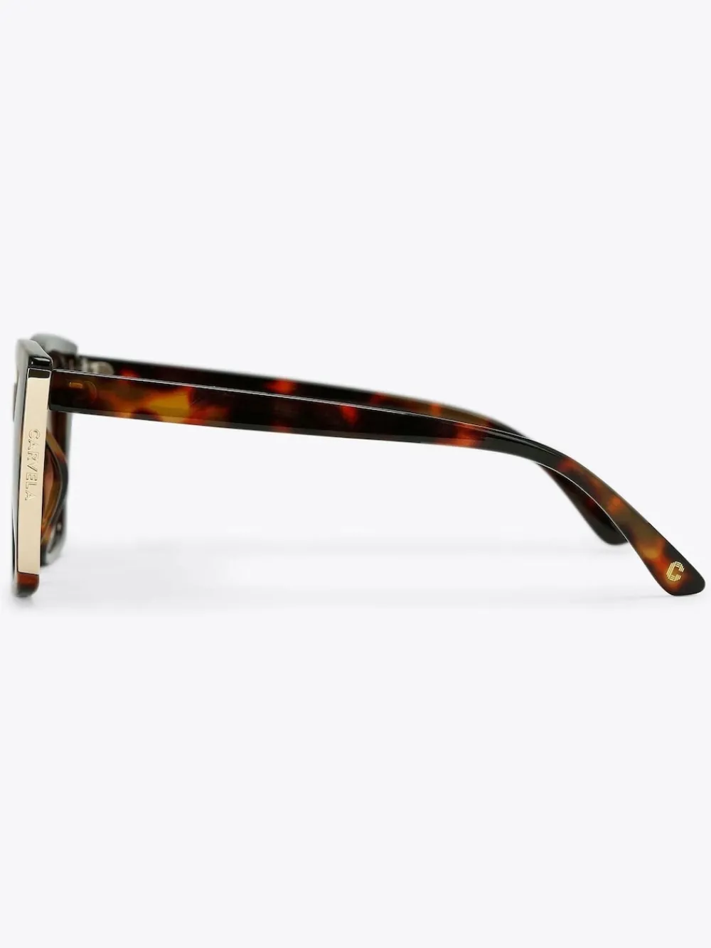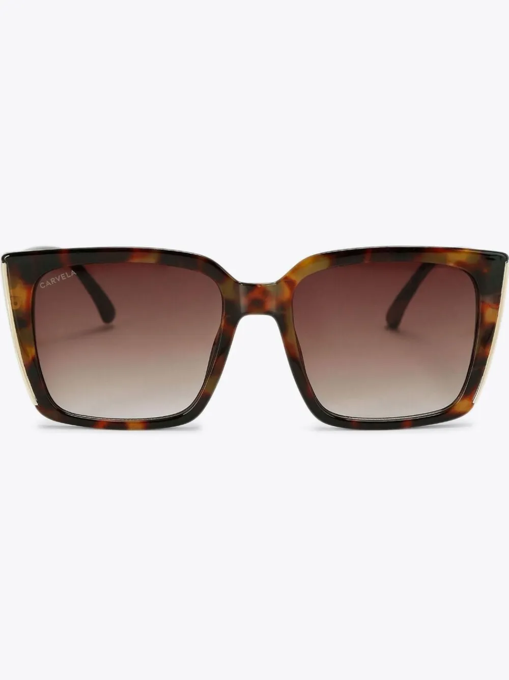 Deze Carvela zonnebril met vierkant montuur heeft een middelbruin, vierkant montuur. De glazen zijn bruin getint en elk montuur is voorzien van een goudkleurig paneel met merklogo aan de zijkant. Deze zonnebril wordt geleverd in een zacht Carvela-zonnebrillenzakje. 100% UVA- en UVB-bescherming. 100% EVA.