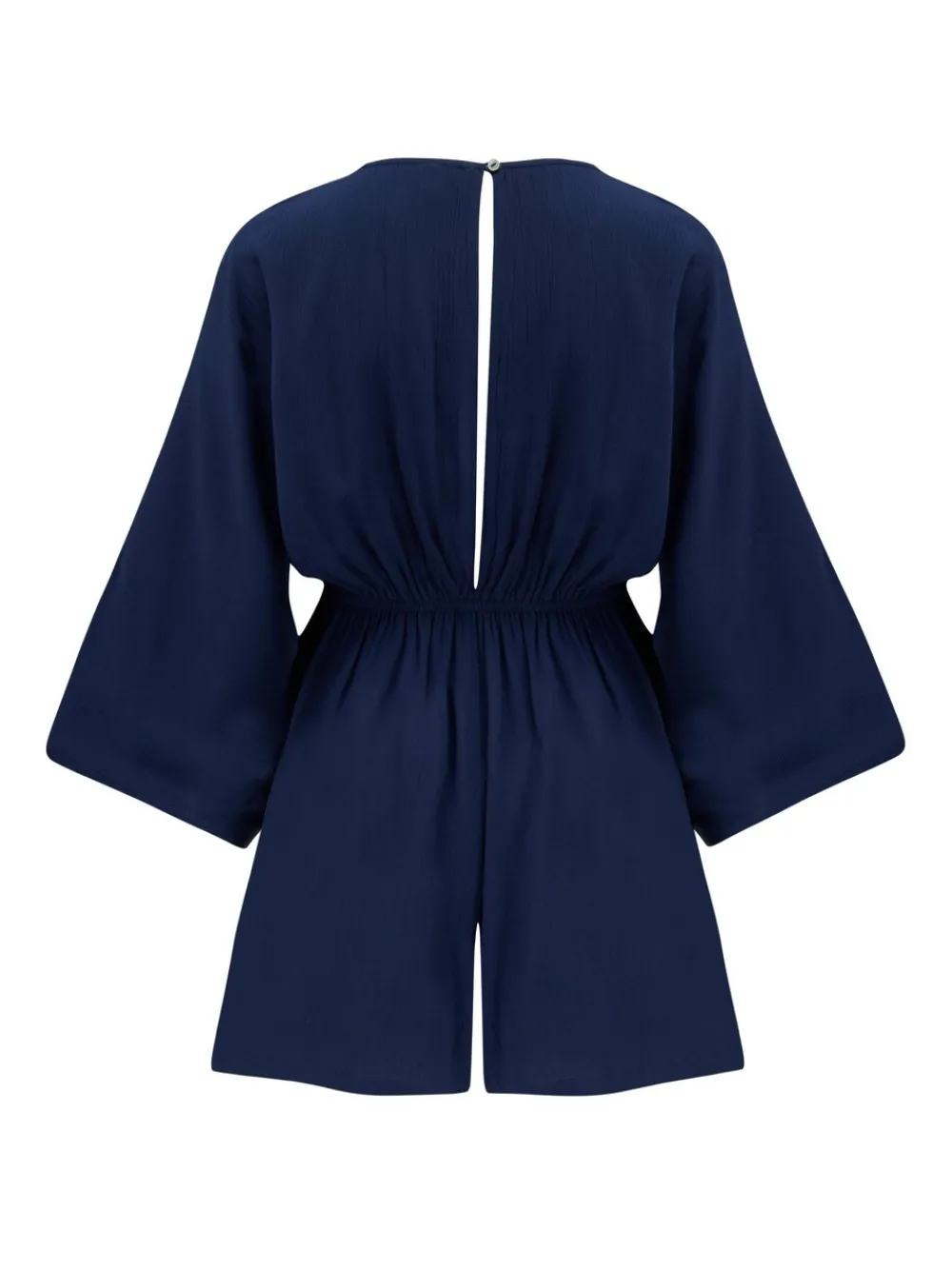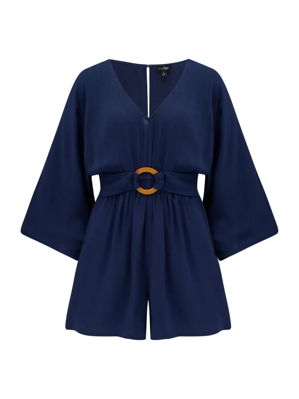 Embrace the carefree spirit of summer with the Crinkle O Ring Beach Playsuit – a versatile and stylish choice for those sunny days when you need something to throw on easily. With a flattering V-Neckline and 3/4 sleeves, and a comfortable elasticated waist for a timeless look that will complement your natural figure. Made from lightweight and breathable fabric and featuring relaxed shorts, this beach playsuit with plastic rattan effect ring detailing provides a laid-back and stylish look that is a must-have addition to your packing list. Machinewasbaar. 100% viscose. Waarschuwing: weg houden bij vuur en vlammen.