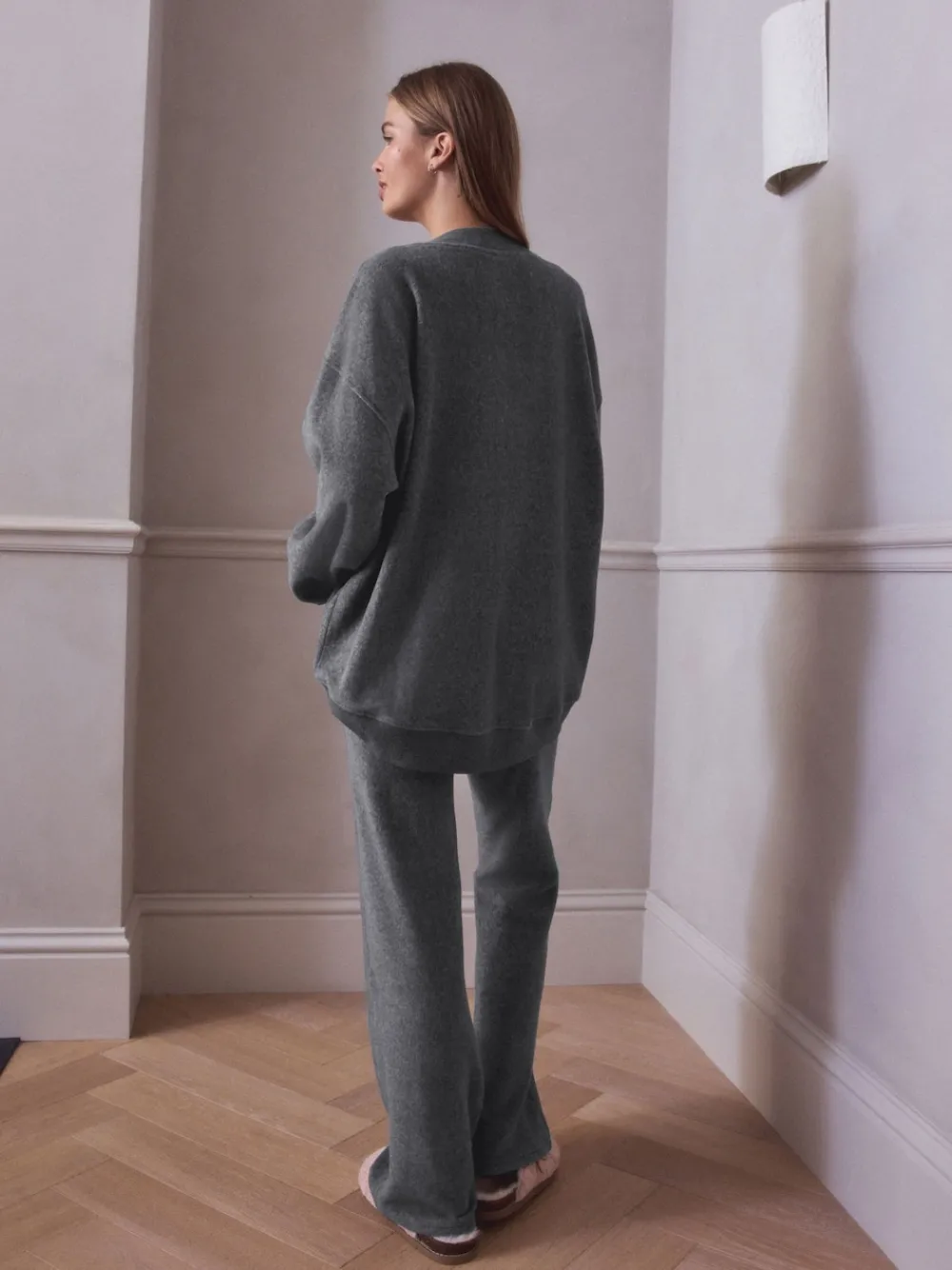 Indulge in maximum cosiness with this super soft grey fleece set, perfect for relaxing at home. The ensemble features an oversized V-neck tunic top and comfortable wide-leg joggers, both made from a plush material with just the right amount of stretch. It’s an essential for elevated lounging, and it’s available in other colours. Super soft fleece material Oversized V-neck tunic top Comfortable wide-leg joggers Ideal for lounging Pyjama Top Main 95% Recycled polyester, 5% Elastane. Rib 95% Cotton, 5% Elastane. Pyjama Bottom 95% Recycled polyester, 5% Elastane. Waarschuwing: weg houden bij vuur en vlammen.