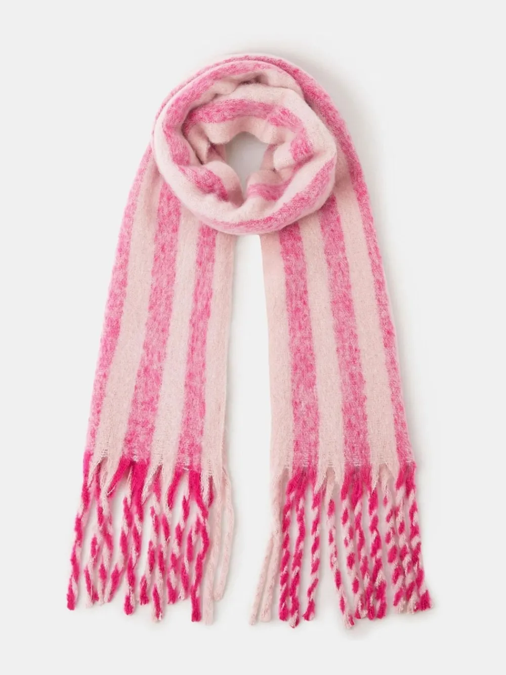 Equal measures playful and plush, this scarf is spun with super-soft yarns in pink candy stripes. An easy way to add a pop of colour to your winter looks. Alleen met de hand wassen. 100% polyester.