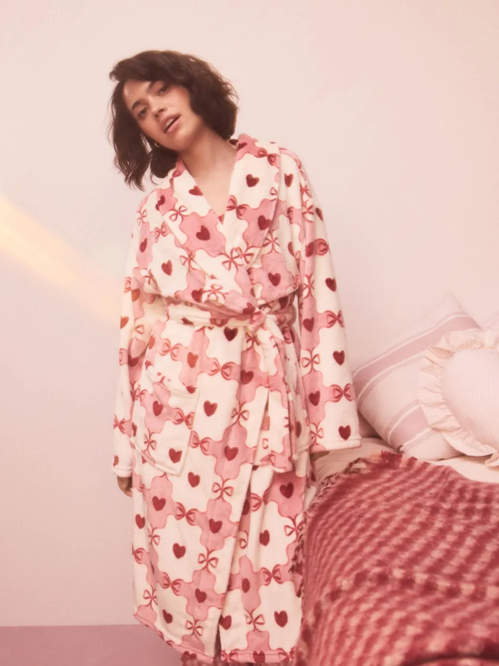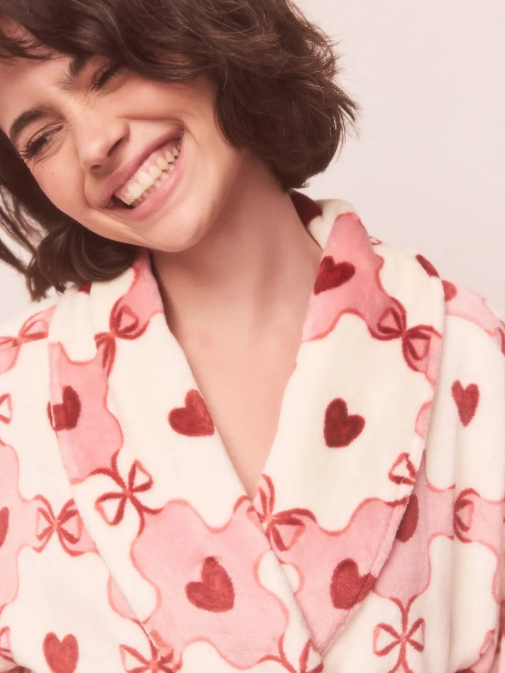 Indulge in ultimate comfort with this supersoft dressing gown. The plush fleece fabric is patterned with a charming print, featuring a cosy shawl collar and tie waist for luxurious, warm relaxation at home. Supersoft fleece fabric 110 cm length Machinewasbaar. 100% gerecycled polyester. Waarschuwing: weg houden bij vuur en vlammen.