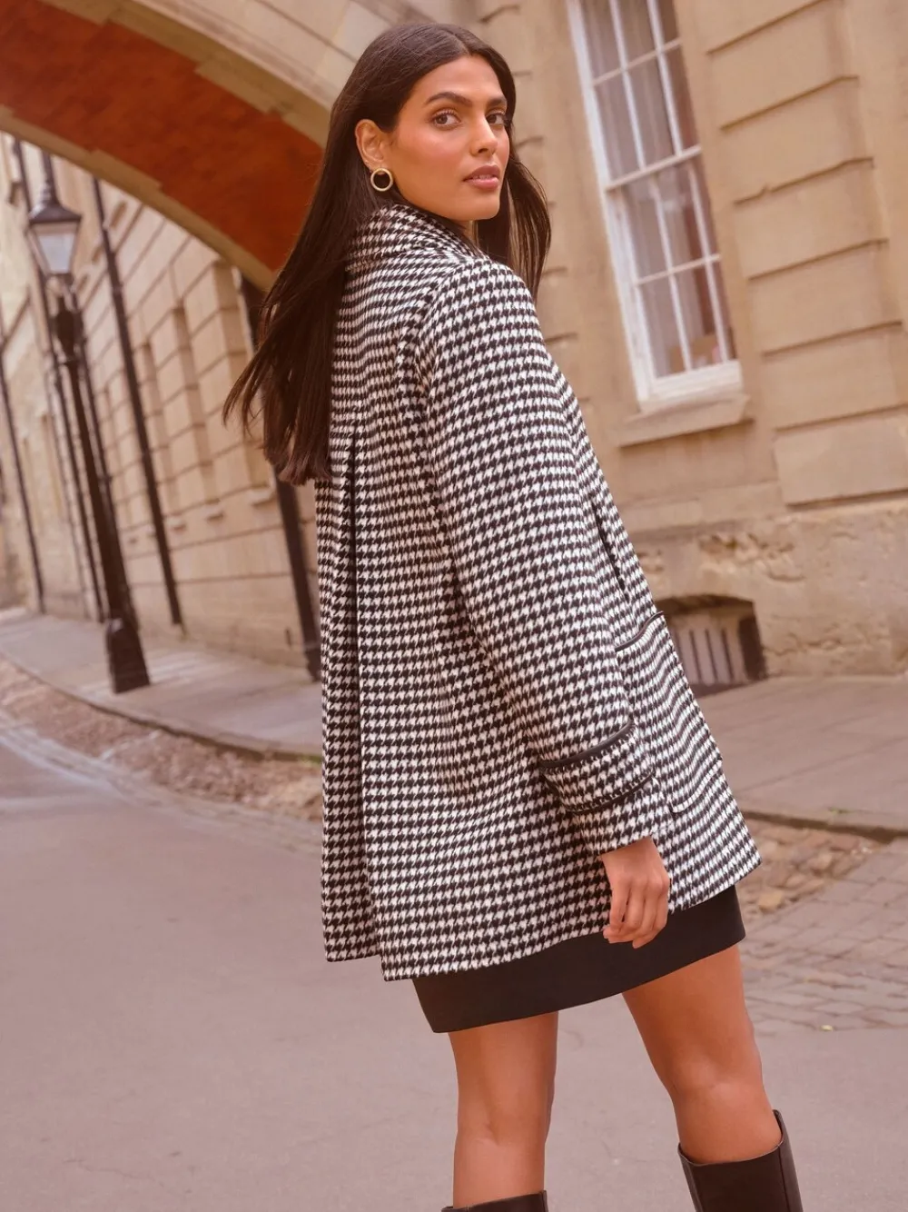 Define your cold-weather style with this chic black and white swing coat. The flattering A-line silhouette and mid length create an elegant drape, while the single-breasted button fastening makes this a sophisticated and versatile choice for everyday wear. Single breasted Mid length Swing A-line cut Hoofdzakelijk 79% polyester, 14% acryl, 4% nylon, 2% katoen, 1% wol. Voering 100% polyester.