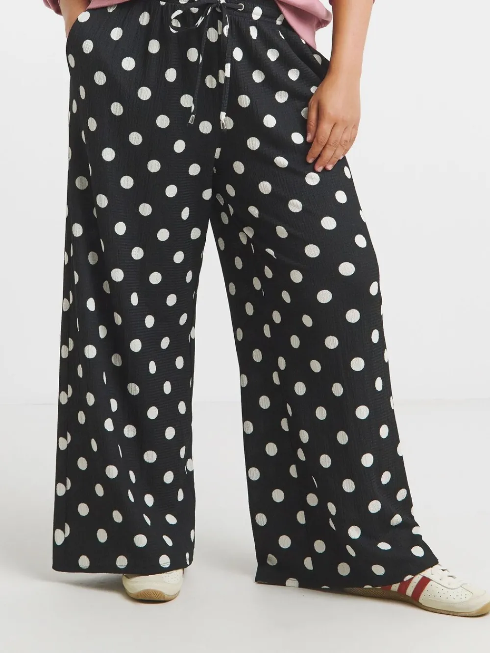 Our new Jersey Waffle Wide Legs are a must-have pair of trousers this season! They feature an elasticated waist, front drawstrings, a cosy jersey fabric, a trendy dark leopard print, and a flattering wide silhouette. Pair with trainers and a tee for the ultimate daytime look. Standaard met binnenbeenlengte van 29″ / 74 cm. Machinewasbaar. 98% polyester, 2% elastaan.