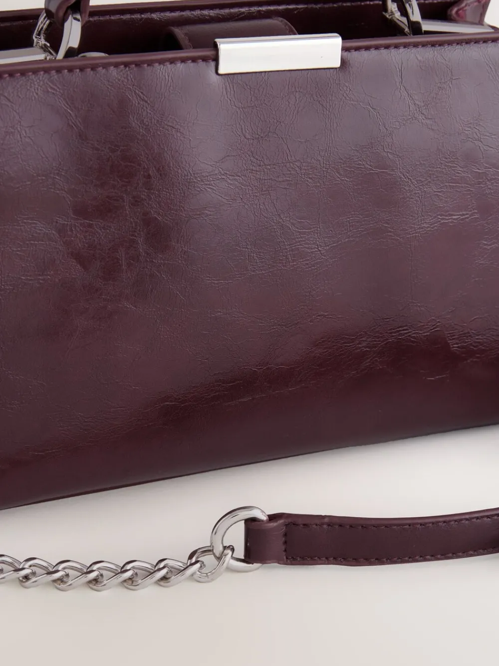 Elevate your everyday accessories with this stylish Top Handle Croc Effect Bag. The crackle vintage effect finish gives it a sophisticated texture, while the zip-close top keeps your essentials secure. It features an optional chain crossbody strap for versatile styling. Crackle vintage effect Optional chain crossbody strap Zip-close fastening Top handle design Hoogte 2,5 cm Breedte 2,5 cm Diepte 1 cm Bovenkant 100% polyurethaan. Voering 100% gerecycled polyester.