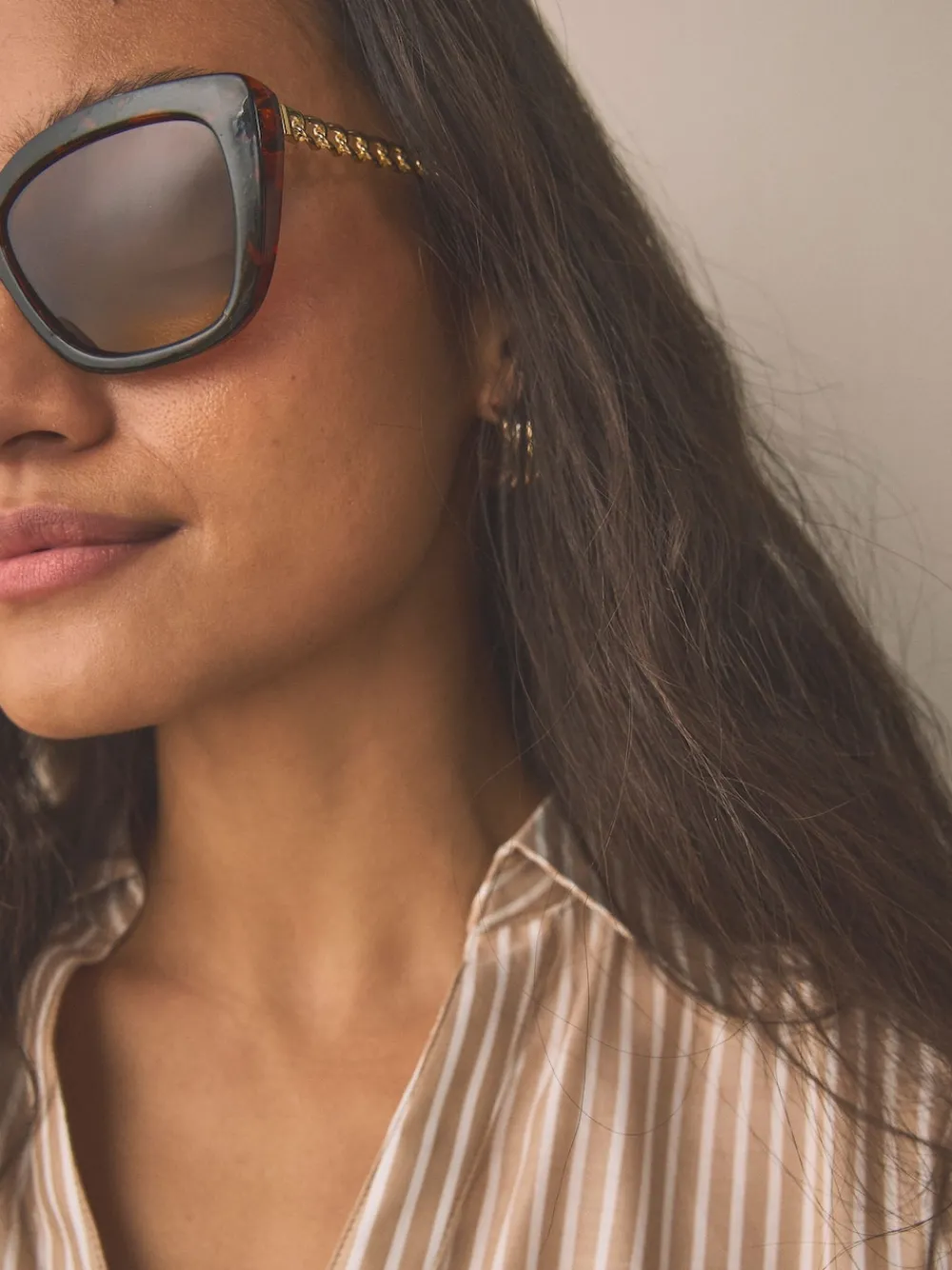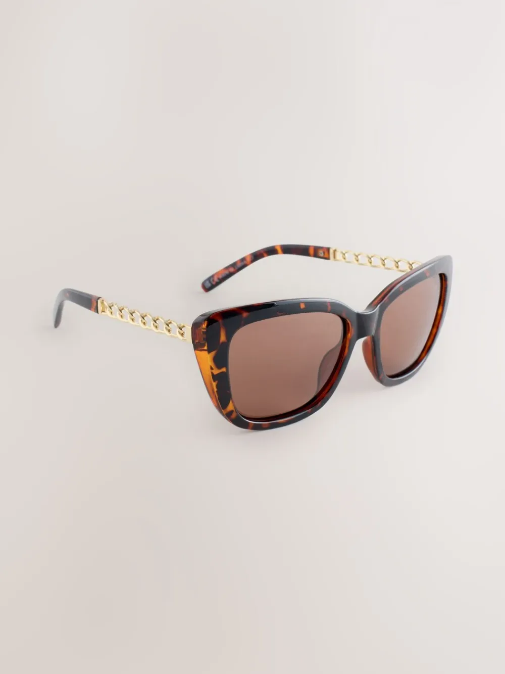 Shade your eyes in glamorous style with these sophisticated tortoiseshell sunglasses. The flattering frame shape features chic gold-tone chain detailing along the arms for a touch of luxury. Filter Category 3 Tortoiseshell brown frame Gold-tone chain arm detailing Hoofdzakelijk 75% gerecycled polycarbonaat, 25% zink. Lens 100% Triacetaat. Gepolariseerde lenzen zijn gecoat met een speciale film die verblinding en de schadelijke effecten van UV-licht helpt verminderen., Hoge bescherming tegen zonlicht