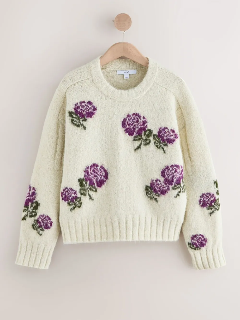 Brighten up cooler days with our Ecru/Purple Floral Crew Neck Jumper With Wool. This elegant piece is designed to bring effortless modern style and elevated comfort to your wardrobe. The jumper features a pretty purple floral pattern and long sleeves, ensuring cosy warmth with a soft knit blend that includes wool. Perfect for refreshing your staples, pair it with dark jeans and boots for easy everyday style. Floral design Crew neck Long sleeve Machinewasbaar. 54% gerecycled polyester, 21% nylon, 11% polyester, 8% wol, 5% alpaca, 1% elastaan.