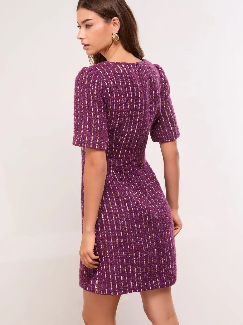 Stand out this party season in this gorgeous purple tweed dress from Lipsy. The mini-length boucle fabric features a chic, structured weave, complemented by a flattering square neckline and short sleeves. Finished with statement pearl-look gold buttons, it offers a sophisticated, glamorous look perfect for special occasions. Mini length Purple tweed/boucle fabric Square neckline Short sleeves Pearl-look gold button detailing Party/special occasion wear Main 83% Polyester, 11% Wool, 5% Metallised fibre, 1% Acrylic. Lining 96% Polyester, 4% Elastane.