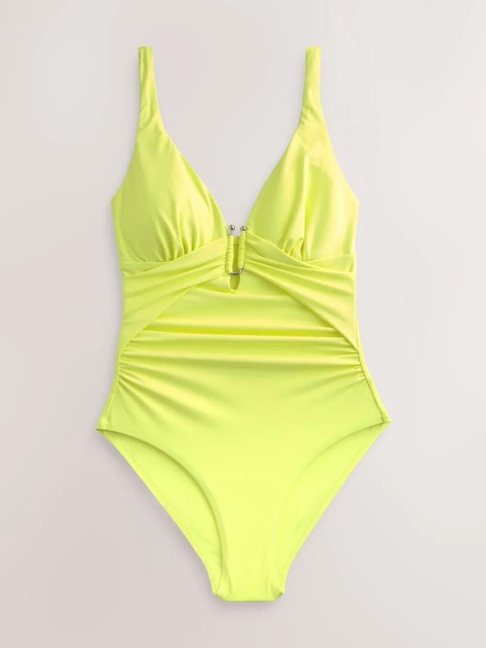 Maak een zomers stijlstatement met dit zwempak, voorzien van een diep decolleté en vormend mesh tot aan de buik voor een gladde look, een centrale afwerking en een keur aan verschillende kleuren en prints. Diepe halslijn Buikcorrigerend mesh SPF 50+ stof Versieringsdetails Hoofdbestanddeel 85% gerecycled polyester, 15% LYCRA® XTRA LIFE™ elastaan. Voering 92% gerecycled polyester, 8% elastaan. Gaas 88% nylon, 12% elastaan. Artikelen met het curve-logo zijn verkrijgbaar in de maten 18 en groter. Onze tall collectie is ontworpen om te passen bij vrouwen van 5’10” en langer. Dit is verhoudingsgewijs vergroot door het lichaam, de benen en de mouwen om de perfecte pasvorm te bereiken. Verkrijgbaar in de maten 8-20., LYCRA® XTRA LIFE™-vezel zorgt dat je ondergoed er langer als nieuw blijft uitzien met comfort- en pasvormbehoud. Dit innovatieve stretchmateriaal weegt weinig, ademt en behoudt zijn vorm bij telkens weer dragen en wassen. Deze stof voldoet aan BS EN 13758. – 1, zorgt voor bescherming tegen ultraviolette zonnestraling. Het is onafhankelijk getest en heeft een UPF-classificatie van 50+ gekregen, wat meer dan 97,5% van de UV-stralen blokkeert. Belangrijk advies: • Blootstelling aan de zon veroorzaakt huidbeschadiging • Alleen bedekte gebieden zijn beschermd • Gebruik altijd een zonnebrandcrème met een hoge beschermingsfactor voor gebieden van de huid die bloot worden gesteld aan de zon • De bescherming van deze stof kan worden verminderd bij gebruik of als het uitgerekt of nat is • Spoel altijd na elk gebruik af met zoet water • De stof biedt UVA- en UVB-bescherming tegen de zon.
