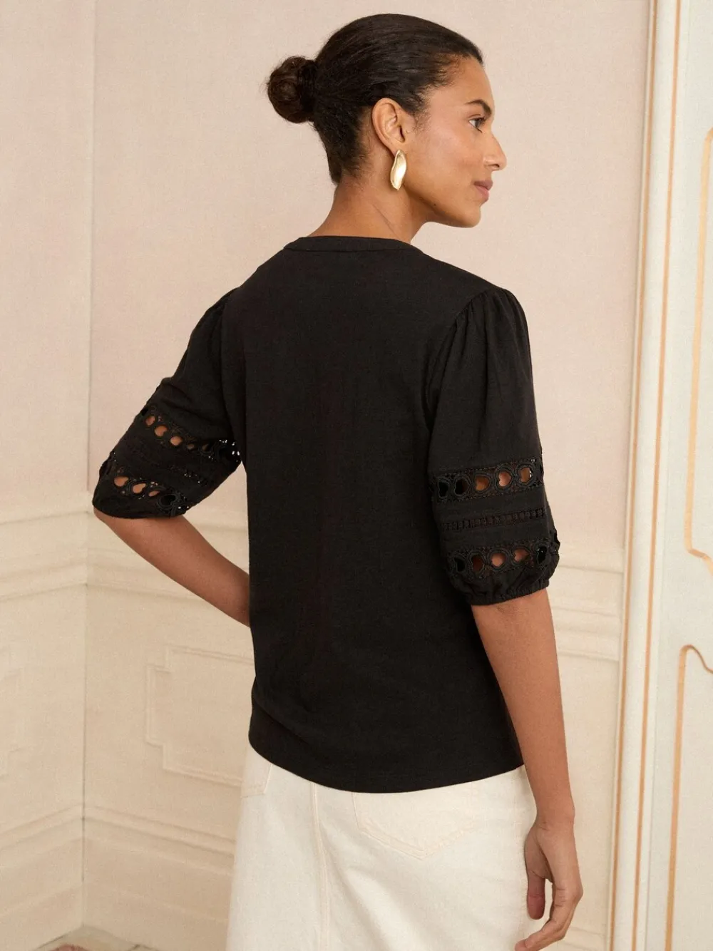 This Love & Roses T-Shirt is an elevated essential for stylish summer wear. The comfortable jersey fabric is beautifully detailed with intricate heart lace inserts on the sleeves, adding a feminine touch. The flattering V-neck and chic elbow-length sleeves make this the perfect top for a light, casual daytime look. Heart lace insert sleeve Jersey fabric V-neckline Elbow length sleeves 100% katoen.