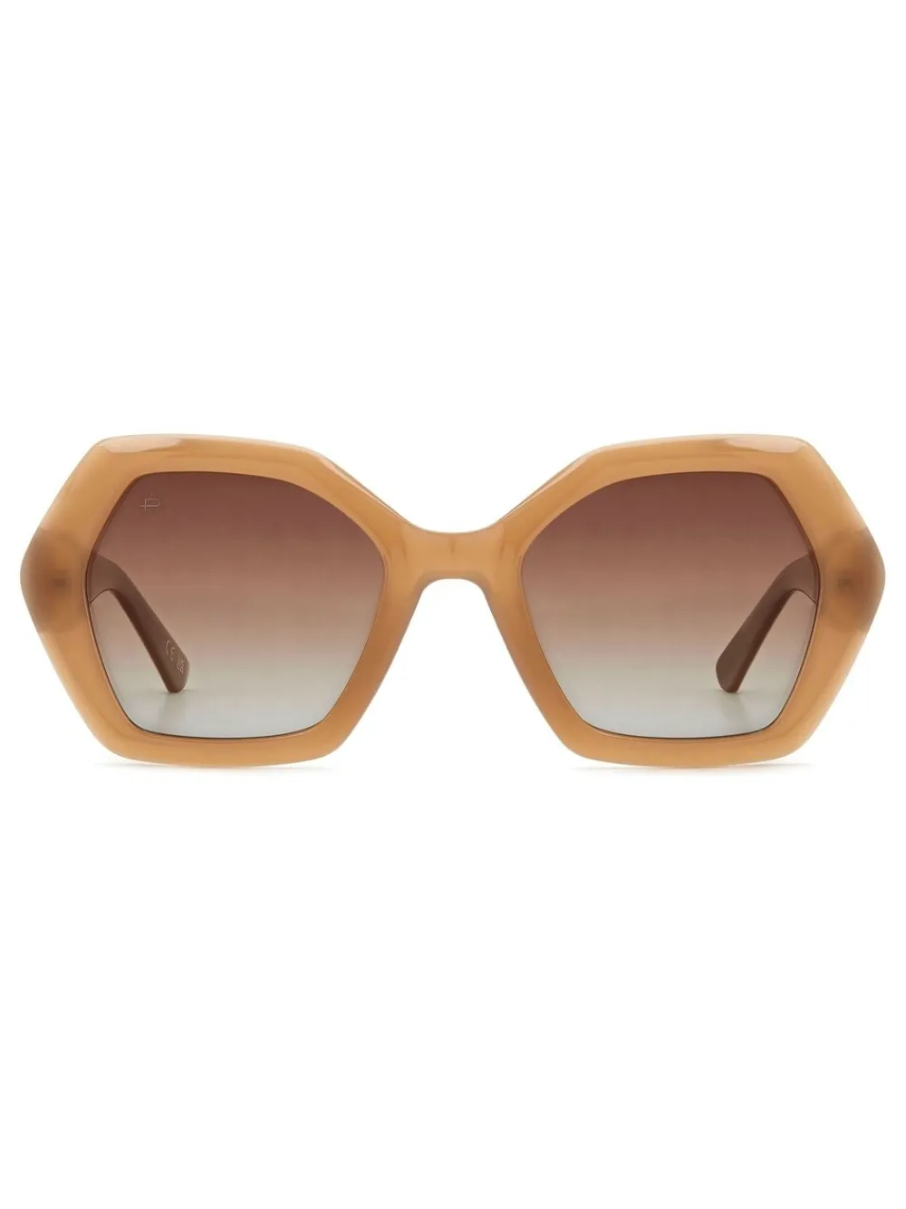 These bold geometric sunglasses feature a stylish oversized frame in a warm caramel hue, offering a retro-chic vibe. Perfect for elevating any outfit with a statement look! 100% cellulosepropionaat.
