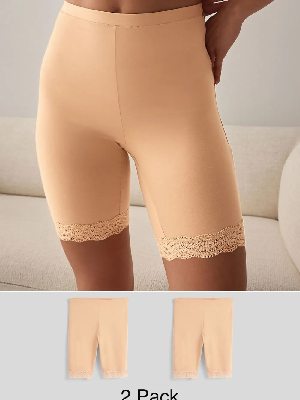 Flattering design, comfortable fit; get the best of both worlds with our anti-chafe nude shorts, designed from a smooth cotton blend, to create a flawless silhouette under tight-fitting outfits. Made from a cotton blend, they feature lace trim details for a seamless finish. Anti-chafe Cotton blend Lace trim details Machinewasbaar. 2 x short hoofdzakelijk 95% katoen, 5% elastaan. Inzetstuk 100% katoen. Artikelen met het curve-logo zijn verkrijgbaar in de maten 18 en groter.
