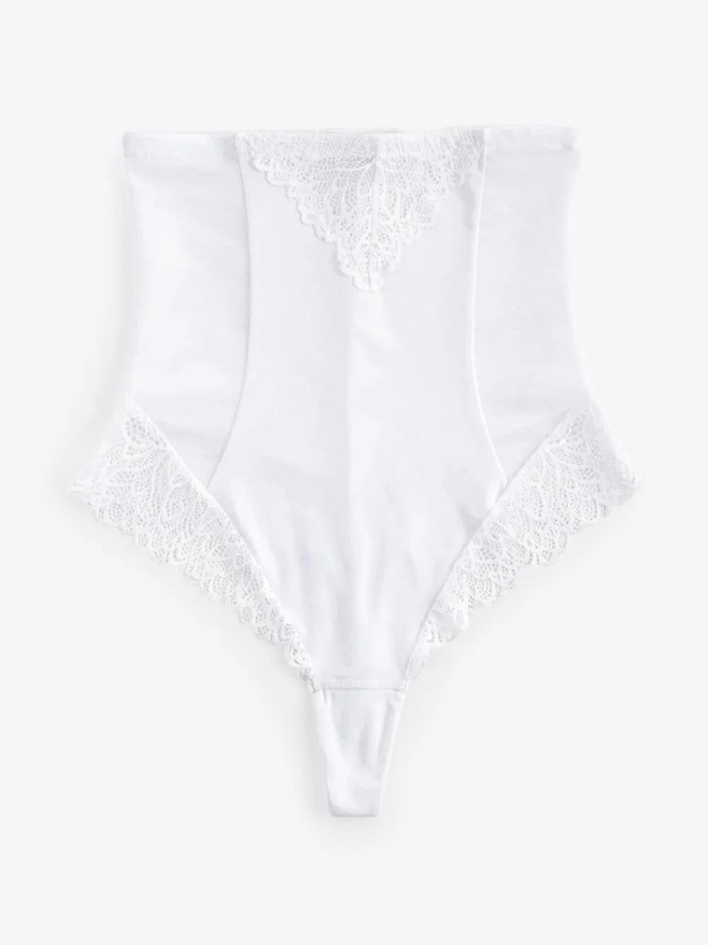 Dit witte ondergoed met hoge taille verstevigt en vormt je buik voor een gladmakend effect onder kleding. Het ondergoed heeft een stringmodel en is afgewerkt met delicate kanten details. Hoge taille Corrigerend ondergoed Vormgevende string Kanten details Machinewasbaar. Buitenkant 81% nylon, 19% elastaan. Inzetstuk 100% katoen. Artikelen met het curve-logo zijn verkrijgbaar in de maten 18 en groter.