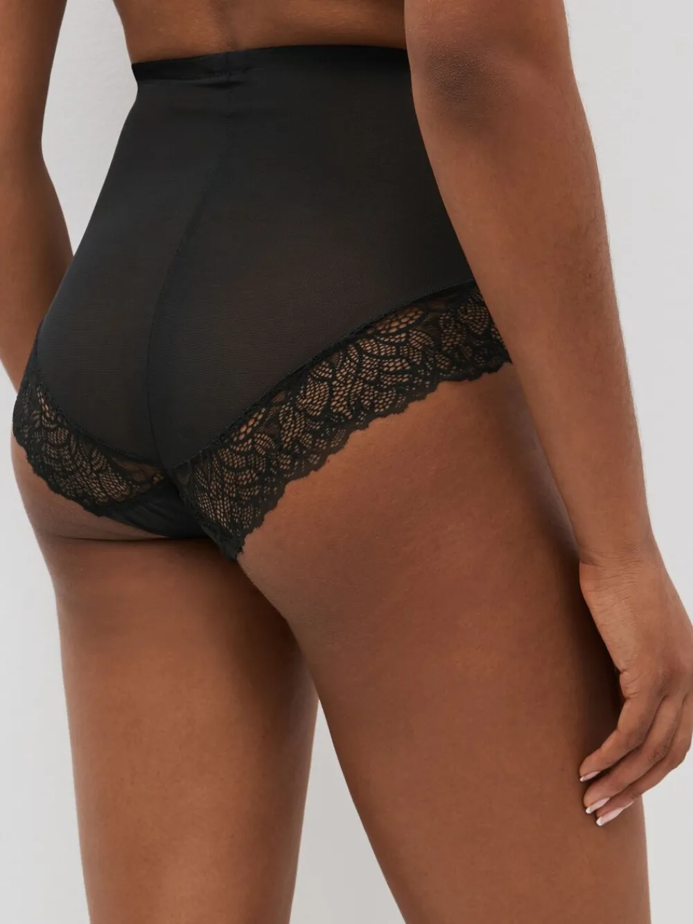 Onze Zwarte corrigerende slips met Hoge taille zijn ontworpen om uw taille te accentueren en uw buikstreek te corrigeren. Ze zorgen voor een verbeterde vorm en bieden tegelijkertijd optimaal comfort. Het hoge model blijft goed zitten en rolt niet af, terwijl de mooie kantversiering ervoor zorgt dat er geen zichtbare lijnen onder uw kleding zijn. Deze veelzijdige shapers zijn perfect om onder strakke outfits te dragen en een onmisbare aanvulling op je Lingeriecollectie. Machinewasbaar. Hoofdzakelijk 70% nylon, 19% elastaan, 11% gerecycled nylon. Inzetstuk 100% katoen. Artikelen met het curve-logo zijn verkrijgbaar in de maten 18 en groter.