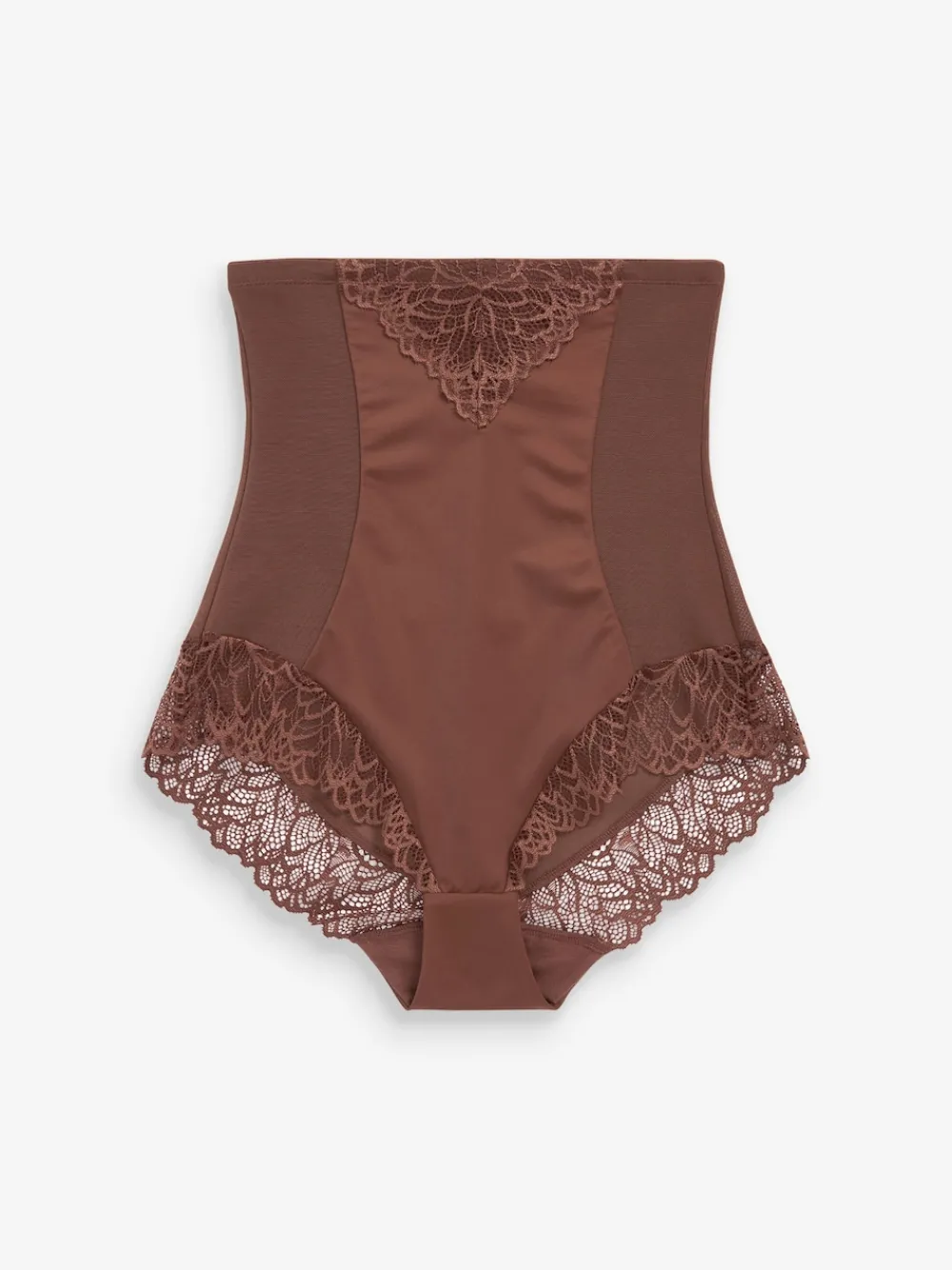 Onze hoge, chocoladebruine corrigerende Onderbroeken zijn ontworpen om uw taille te accentueren en uw buikstreek te corrigeren. Ze zorgen voor een verbeterde vorm en bieden tegelijkertijd optimaal comfort. Het hoge model blijft goed zitten en rolt niet af, terwijl de mooie kantversiering ervoor zorgt dat er geen zichtbare lijnen onder uw kleding zijn. Deze veelzijdige shapers zijn perfect om onder strakke outfits te dragen en een onmisbare aanvulling op je Lingeriecollectie. Machinewasbaar. Buitenkant 82% nylon, 18% elastaan. Inzetstuk 100% katoen. Artikelen met het curve-logo zijn verkrijgbaar in de maten 18 en groter.