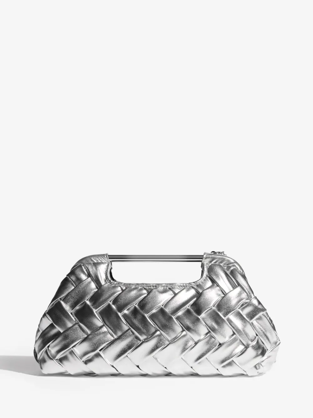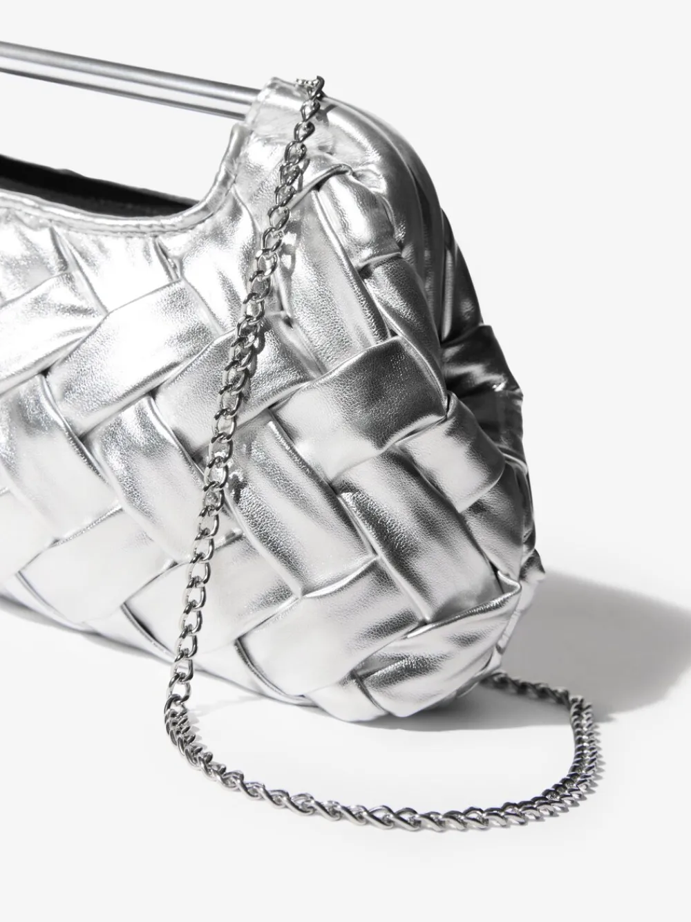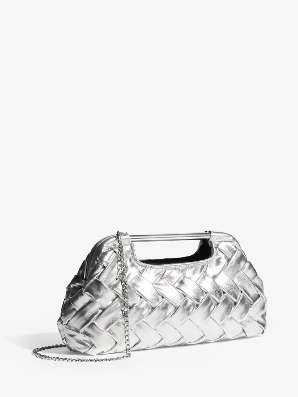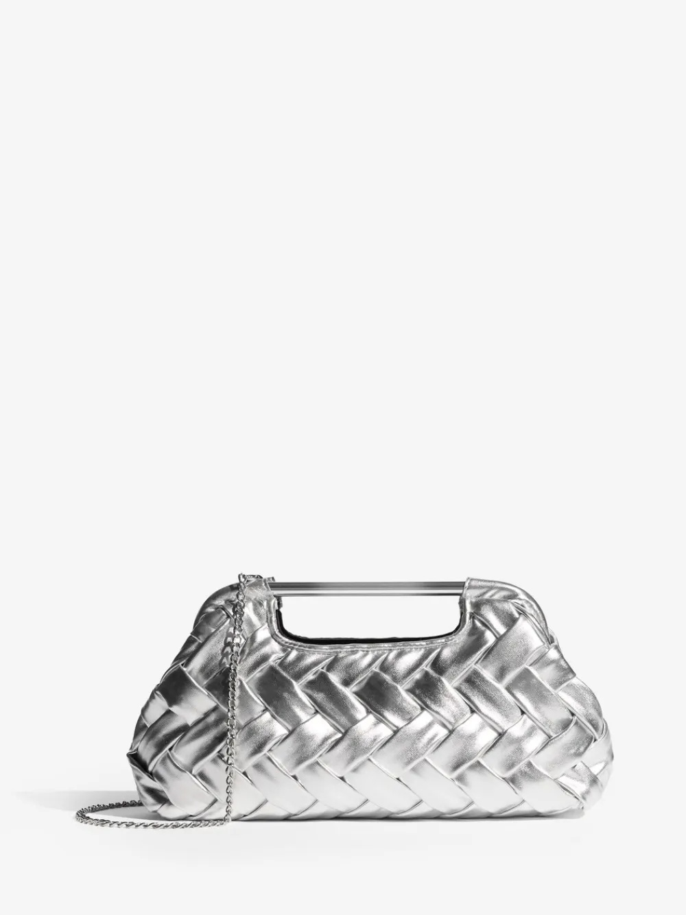 Make a metallic statement with this striking weave clutch bag. The soft, tactile weave material creates a sophisticated texture, while the polished silver grab handle adds a modern edge. Perfect for evening events, it includes a detachable chain strap for versatile shoulder or cross-body wear Weave material texture Polished grab handle Detachable chain strap Hoogte 16 cm Breedte 29 cm Buitenkant 100% polyester met coating van PU. Voering 100% polyester.