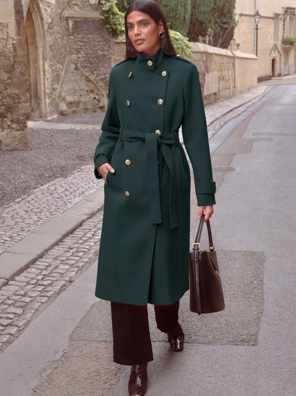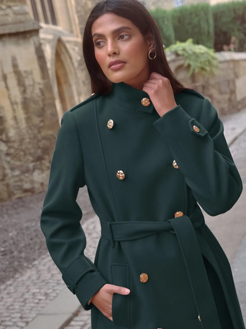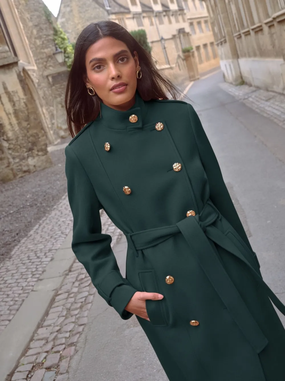 Step out in timeless elegance with the Love & Roses Teal Blue Funnel Neck Wrap Coat. This stunning midi-length piece is designed to elevate any outfit with its sophisticated, military-inspired detailing and flattering silhouette. It features a chic funnel neck and double-breasted front adorned with eye-catching gold-tone buttons, complemented by smart epaulette shoulder details. The coat’s luxurious shape is defined by a cinching wrap belt, allowing you to tailor the fit perfectly for a polished, hourglass look. Crafted in a versatile and rich teal blue hue, this coat is the perfect investment to keep you warm and stylish throughout the colder seasons. Funnel neck Midi length Wrap belt detail Hoofdbestanddeel 100% polyester. Voering 100% polyester.