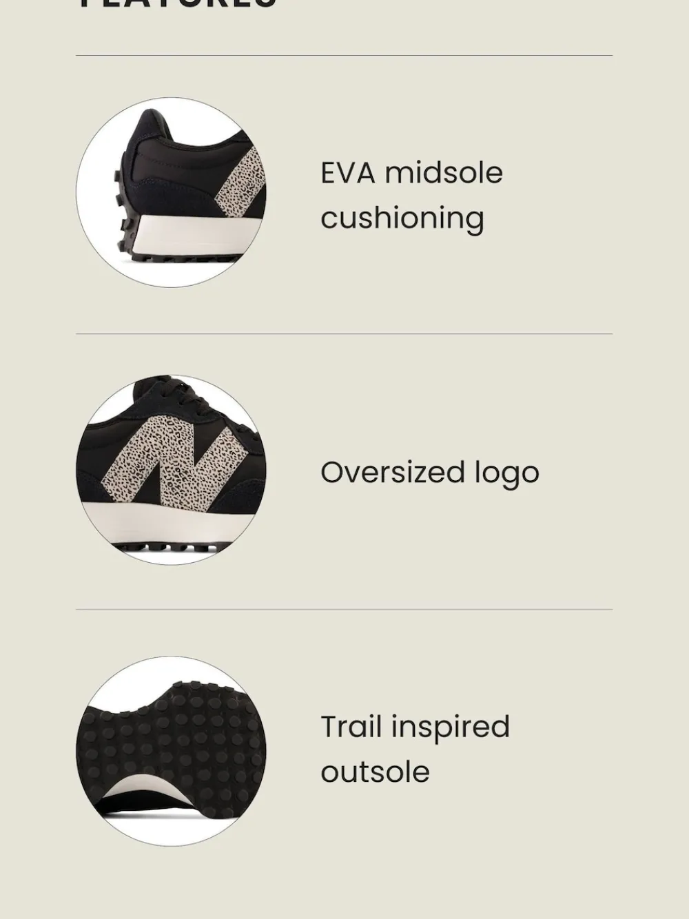 De Wit/Blauwe 327 werpt een nieuw licht op de jaren70als een tijdperk van innovatie door klassieke designelementen gedurfd een nieuwe vorm te geven met een geheel eigentijdse uitstraling. Met een hoekige herwerking van het beproefde silhouet met sleehakken, een extra groot formaat, asymmetrisch aangebrachte ‘N’-branding en een omsluitende, op trails geïnspireerde noppenzool, is de 327 een ware herinterpretatie van ons hardloopverleden. Bovenwerk – Leer, textiel, voering en binnenzool – Textiel zool – Andere materialen.
