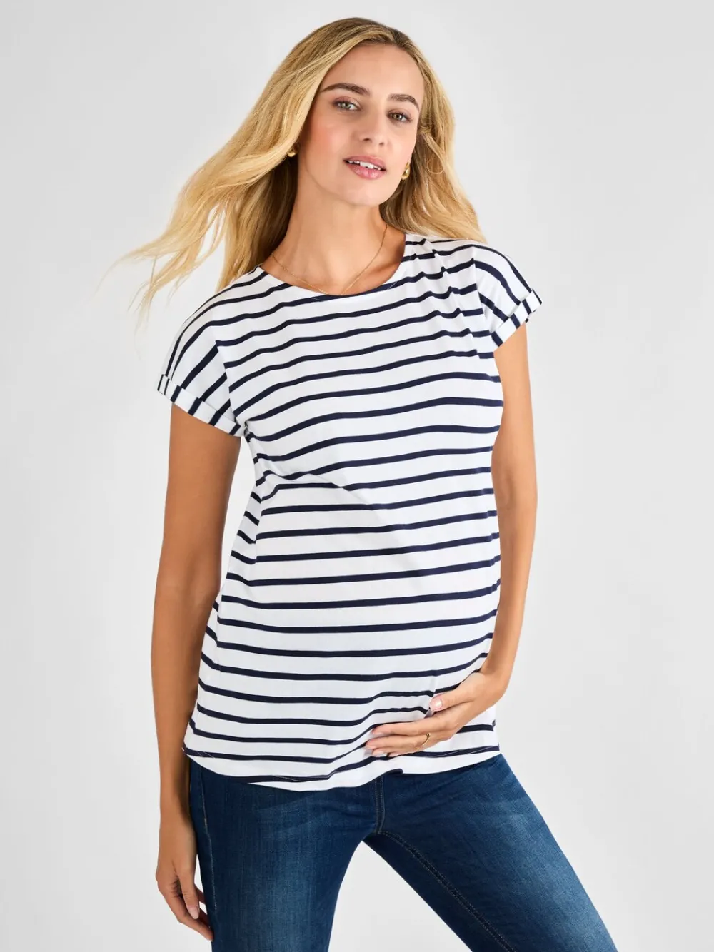 You can never have too many great basics. Our quality White and Navy Stripe Boyfriend Cotton Maternity T-Shirt is the ultimate everyday piece that keeps your style feeling like you, just with a little more room to grow. The relaxed boyfriend fit, round neckline, and short sleeves with turn-back cuffs make it a go-to for every trimester. Pair it with your favourite maternity jeans, soft trousers, shorts, or layer it under dungarees – it’s the perfect starting point for countless comfy, effortless looks. Designed to fit throughout pregnancy White and navy stripes Relaxed jersey fit for growing bump Round neck Short sleeves with turn-back cuffs Machine washable Machinewasbaar. 100% katoen.