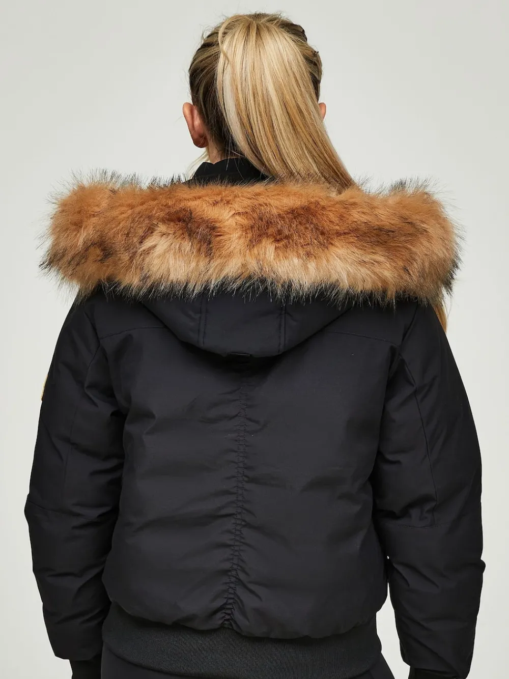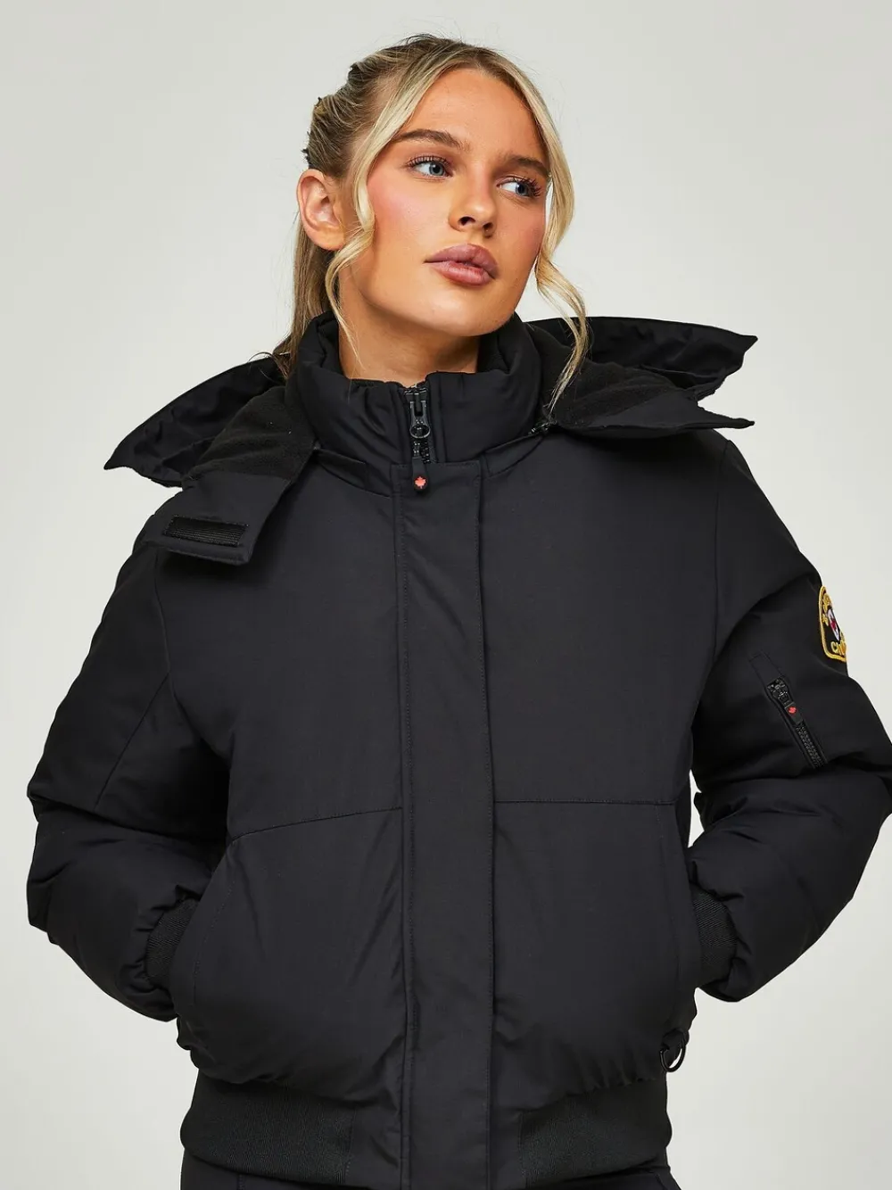 Keep the cold out with this women s Olivia Asphalt Bomber Jacket from Zavetti Canada. This cropped jacket has a full zip front and a popper fastening flap that extends up the chin. The stretchy ribbed trims shape the fit, and the fluffy faux fur trim hood is removable so you can pick and choose the times to unleash it. Finished off with multiple pockets and signature Zavetti Canada branding. Machinewasbaar. 100% katoen.