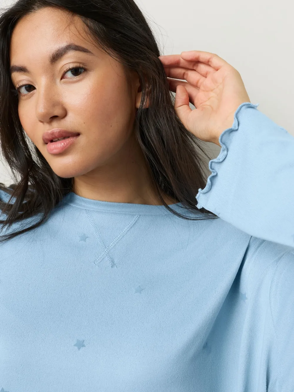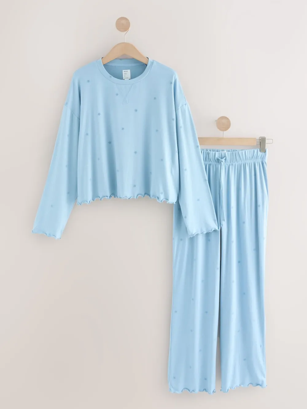 Relax in heavenly comfort with these Blue Star Soft Long Sleeve Pyjamas. This set is designed to be super soft and comfy, crafted from a light blue fabric scattered with a subtle star print. The top features a cosy, slouchy fit and long sleeves, while the wide-leg trousers have a comfortable elasticated drawstring waist. Both the top and trousers are finished with a delicate, feminine lettuce edging along the hems, making this the ultimate set for restful evenings. 2 piece set Super soft and comfy Elasticated waist Machinewasbaar. Pyjamatop en pyjamabroek van 95% gerecycled polyester, 5% elastaan. Waarschuwing: Blijf uit de buurt van vuur en vlammen. Onze tall collectie is ontworpen om te passen bij vrouwen van 5’10” en langer. Dit is verhoudingsgewijs vergroot door het lichaam, de benen en de mouwen om de perfecte pasvorm te bereiken. Verkrijgbaar in maat 8-20.