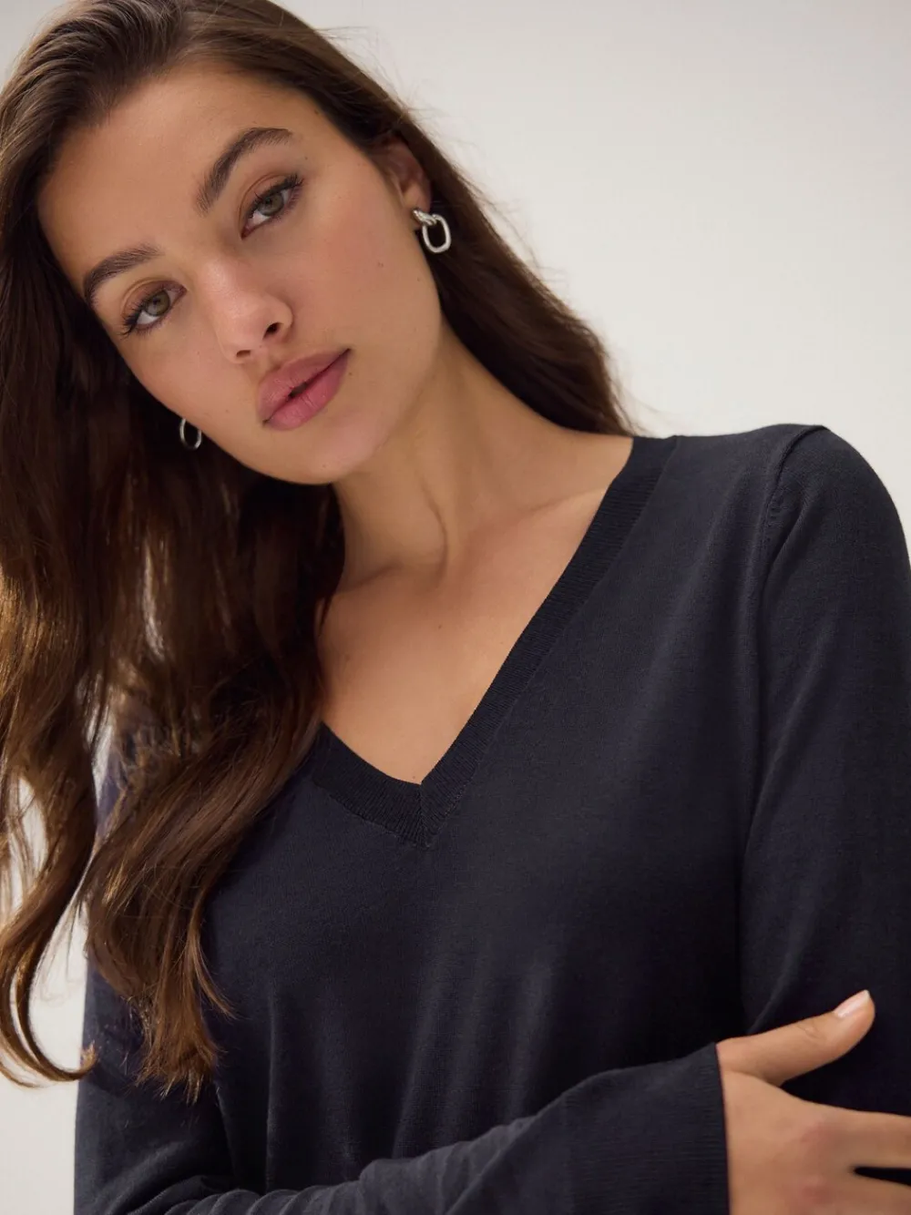 Discover the perfect layering piece with this classic V-neck jumper in blue navy. Crafted from a fine knit with cotton, it offers comfortable, breathable wear. The timeless V-neck and long sleeves ensure a versatile silhouette, making it an essential addition for effortless smart-casual or everyday styling. Long Sleeve V Neck Cotton Fine knit Machinewasbaar. 60% katoen, 40% Livaeco™-viscose. Onze tall collectie is ontworpen om te passen bij vrouwen van 5’10” en langer. Dit is verhoudingsgewijs vergroot door het lichaam, de benen en de mouwen om de perfecte pasvorm te bereiken. Verkrijgbaar in maat 8-20.