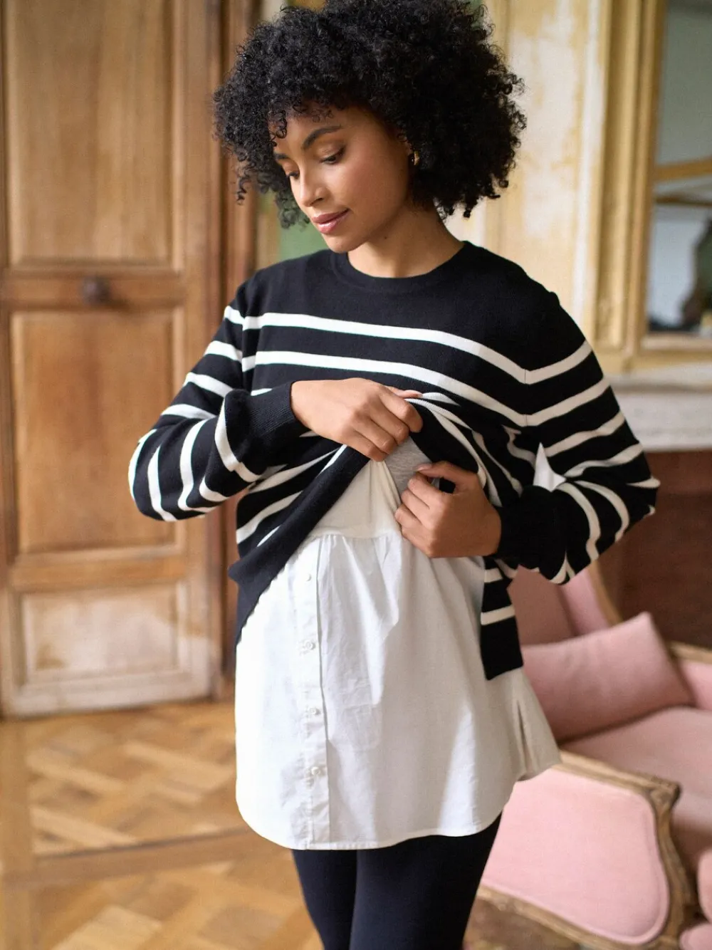 Zacht gebreide trui Afneembaar imitatie-shirt met jersey voedingslijfje Opklapbaar borstvoedingsgedeelte Klassiek gestreept ontwerp Shirt en trui kunnen apart worden gewassen en gedragen Onze Layered Maternity & Nursing Jumper is een stijlvolle trui met een slim geheim voor het geven van borstvoeding. Hij is ideaal voor tijdens de zwangerschap, het geven van borstvoeding en als nieuwe moeder. De klassieke gestreepte trui heeft een relaxte pasvorm die perfect is bijgesneden en je figuur flatteert. Daaronder zit een volledig uitneembaar imitatie-shirt dat de look accentueert en verlengt. Zodra de baby geboren is, kan de jumper omhoog worden geklapt, zodat je hem gemakkelijk kunt voeden. Je kunt de twee kledingstukken samen of apart dragen en het voedingsshirt combineren met andere topjes en truien uit je garderobe. Machinewasbaar. 80% viscose, 20% nylon.
