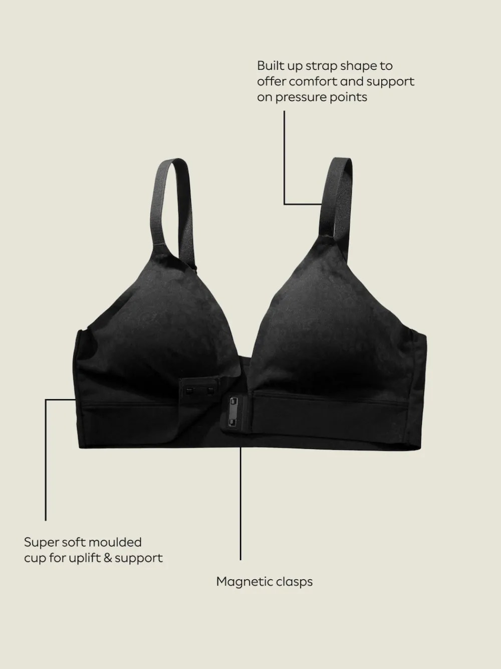 Experience effortless dressing with this black adaptive bralette. Designed with a convenient magnetic clasp at the centre front, it combines ease with support. It features a super soft moulded cup for uplift, a built-up strap shape for pressure point comfort, and super soft elastic for all-day wear. Magnetic clasps at centre front Super soft moulded cup Built up strap shape Machinewasbaar. 65% Nylon, 35% elasthaan.