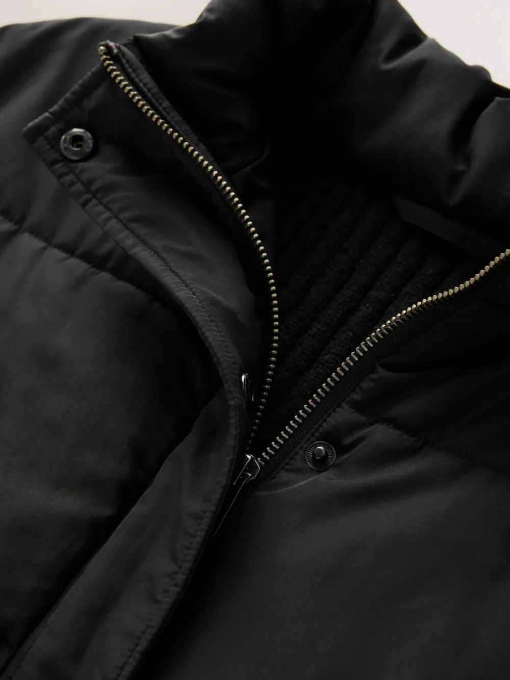 Layer up easily with this essential black padded gilet. The sleeveless design and puffer styling offer core warmth without bulk, while the high funnel neck adds extra cosiness. Perfect for effortless casual wear and layering over jumpers or hoodies during transitional weather. Padded gilet style Funnel neck Sleeveless design Front fastening Shell 100% Recycled polyester. Knit 67% Acrylic, 28% Recycled polyester, 5% Elastane.