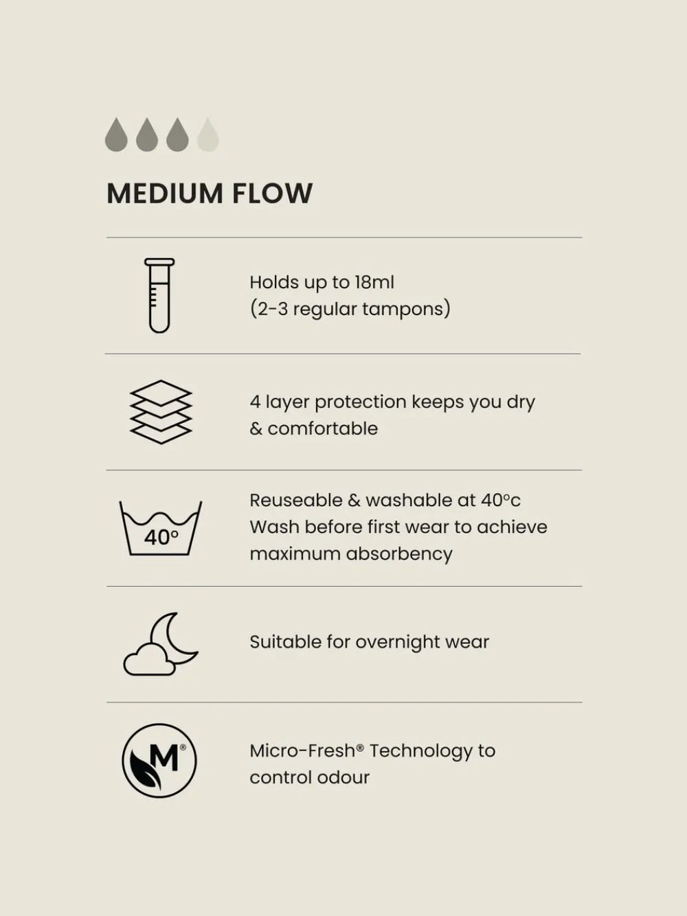 Medium Flow kan op zichzelf worden gebruikt of als onderdeel van uw gebruikelijke routine op zwaardere dagen. Hoog beenmodel Houdt tot 18 ml/ongeveer 2-3 gewone tampons vast Vierlaagse bescherming houdt je droog en comfortabel Gewoon wassen en dragen Was voor het eerste gebruik om maximale absorptie te bereiken, gebruik geen wasverzachter en hang te drogen Superzachte, comfortabele stof Elastische taille Let op: dit product bevat het biocide Zilverchloride (herdefinieerd uit een reactiemassa van titaniumdioxide en Zilverchloride) Machinewasbaar. Hoofdmateriaal 95% katoen, 5% elastaan. Inzetstuk 65% polyester, 35% katoen. Artikelen met het curve-logo zijn verkrijgbaar in de maten 18 en groter.