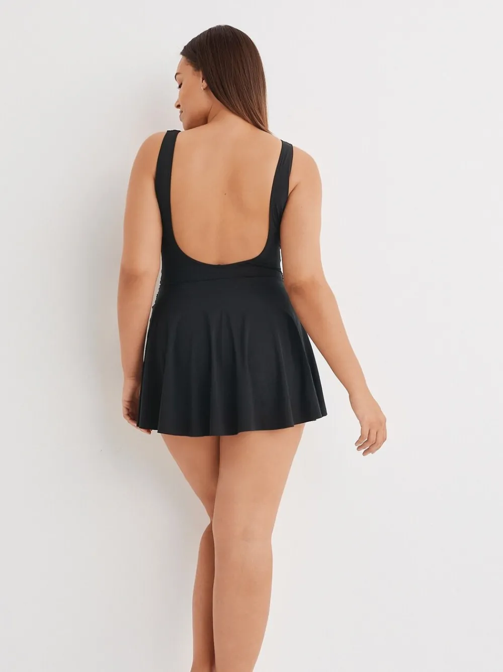 Ons zwarte zwemjurkje heeft een geweldige pasvorm en zorgt ervoor dat u zich comfortabel voelt tijdens het zwemmen of relaxen bij het zwembad. Met dikke bandjes en een rokje voor een flatterende vrouwelijke pasvorm. Dikke bandjes Rokje Machinewasbaar. Hoofdmateriaal 85% nylon, 15% LYCRA® XTRA LIFE™ elastaan. Voering 92% polyester, 8% elastaan. Onderste voering 88% nylon, 12% elastaan. Artikelen met het curve-logo zijn verkrijgbaar in de maten 18 en groter. LYCRA® XTRA LIFE™-vezel zorgt ervoor dat je ondergoed er langer als nieuw uitziet, met langdurig comfort en pasvorm. Dit innovatieve stretchmateriaal weegt weinig, ademt en behoudt zijn vorm bij telkens weer dragen en wassen. Deze stof voldoet aan BS EN 13758. – 1, zorgt voor bescherming tegen ultraviolette zonnestraling. Het is onafhankelijk getest en heeft een UPF-classificatie van 50+ gekregen, wat meer dan 97,5% van de UV-stralen blokkeert. Belangrijk advies: • Blootstelling aan de zon veroorzaakt huidbeschadiging • Alleen bedekte gebieden zijn beschermd • Gebruik altijd een zonnebrandcrème met een hoge beschermingsfactor voor gebieden van de huid die bloot worden gesteld aan de zon • De bescherming van deze stof kan worden verminderd bij gebruik of als het uitgerekt of nat is • Spoel altijd na elk gebruik af met zoet water • De stof biedt UVA- en UVB-bescherming tegen de zon.