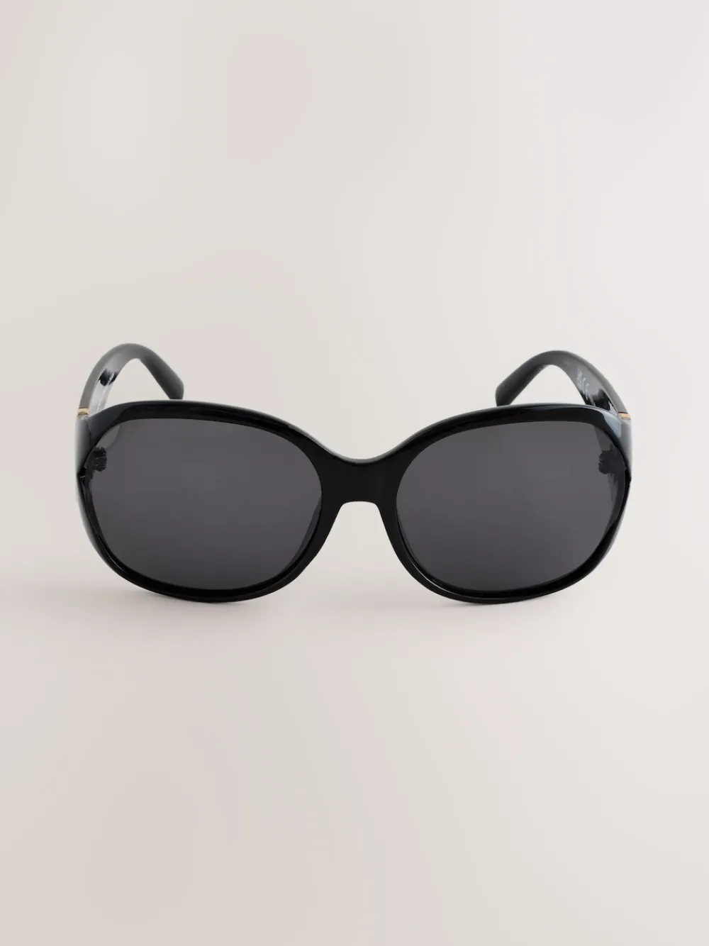 Achieve sophisticated sun protection with these stylish black sunglasses. The flattering, slightly wrap around oval shape is accented by elegant gold-tone trim on the side temples. Filter Category 3 Black oval wrap around frame Hoofdzakelijk 90% gerecycled polycarbonaat, 10% zink. Lens 100% Triacetaat. Gepolariseerde lenzen zijn gecoat met een speciale film die verblinding en de schadelijke effecten van UV-licht helpt verminderen., Hoge bescherming tegen zonlicht
