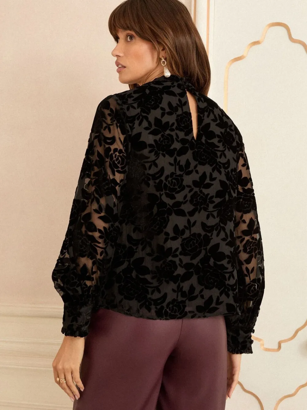 Zwarte fluwelen Devoré – blouse met lange mouwen en striksluiting*Love & Roses Clearance